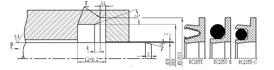 RC2055-C-40-PTFE4+R02: Diámetro del eje 40, material del anillo de sellado PTFE4, la junta tórica correspondiente es caucho fluorado.